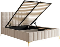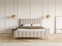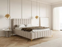 Miegamojo lova AURI, šviesiai rudos spalvos – subtili ir moderni, su minkštu stačiakampiais dygsniais dekoruotu galvūgaliu. Metalinis stelažas su dujiniais pakėlėjais užtikrina stabilumą ir patogų pakėlimą, o auksinės aukštos kojelės suteikia prabangos akcentą.