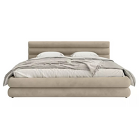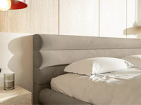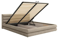 Miegamojo lova FLORENCE, Piano 04 – stilinga lova su patalynės dėže. Šviesiai rusvai pilkas veliūras su subtiliu blizgesiu, hidrofobinis ir lengvai valomas, o metalinis stelažas užtikrina stabilumą.