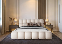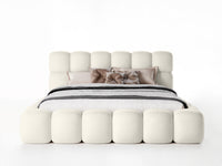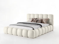 Lova JASMIJA su ecru piano audiniu – aptraukta audiniu PIANO 01. Aukštas galvūgalis su dekoratyviniais dygsniais suteikia lovai išskirtinumo, o integruota patalynės dėžė padeda patogiai laikyti tekstilę ir palaikyti tvarką miegamajame. Čiužinys į komplektą neįeina.
