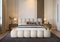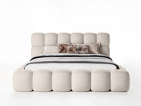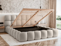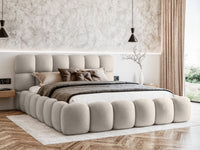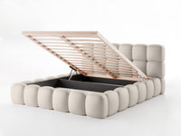 Lova JASMIJA su šviesiai smėlio piano audiniu – aptraukta audiniu PIANO 02. Aukštas galvūgalis su dekoratyviniais dygsniais suteikia lovai išskirtinumo, o integruota patalynės dėžė padeda patogiai laikyti tekstilę ir palaikyti tvarką miegamajame. Čiužinys į komplektą neįeina.