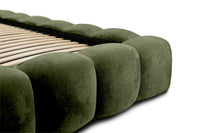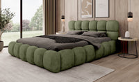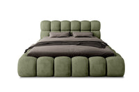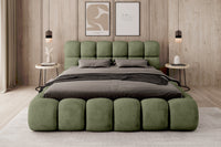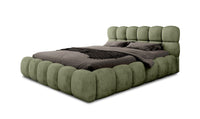 Lova JASMIJA su tamsiai žalia aphrodite audiniu – aptraukta audiniu APHRODITE 12. Aukštas galvūgalis su dekoratyviniais dygsniais suteikia lovai išskirtinumo, o integruota patalynės dėžė padeda patogiai laikyti tekstilę ir palaikyti tvarką miegamajame. Čiužinys į komplektą neįeina.