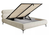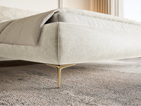 Miegamojo lova LUMINA, šviesiai pilkai smėlinės spalvos – modernus, apvalintų formų siluetas su dvigubu ovalu dekoruotu galvūgaliu ir aukštomis auksinėmis kojelėmis. Metalinis rėmas su dujiniais pakėlėjais bei 34 lamelėmis suteikia tvirtą atramą ir leidžia patogiai pasiekti erdvų dviejų kamerų patalynės skyrelį.