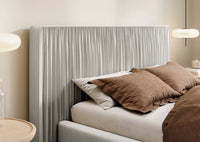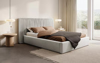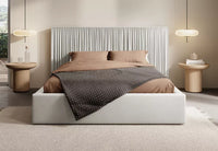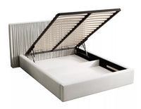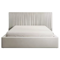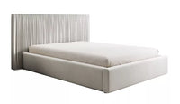 Miegamojo lova LURA – kreminio atspalvio veliūras ir elegantiškos galvūgalio klostės sukuria jaukią atmosferą. Patvarus metalinis stelažas su dujiniais pakėlėjais suteikia sklandų pakėlimą ir priėjimą prie erdvios patalynės dėžės.