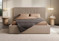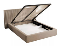 Miegamojo lova LURA – modernus veliūrinis dizainas su minkštu, klostėmis puoštu galvūgaliu. Dujiniai pakėlėjai ir metalinis stelažas leidžia lengvai pasiekti po lova esančią talpią patalynės dėžę.