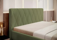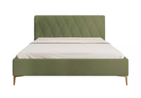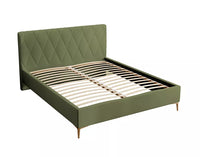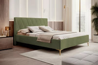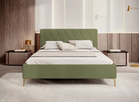 Miegamojo lova MARI Velluto 35 spalvos (alyvuogių) iš veliūro – prabangi ir šiuolaikiška. Aukštas galvūgalis su geometriniais raštais tampa kambario akcentu, o auksinės metalinės kojelės kuria stilingą kontrastą. Audinys aksominis, švelnus, atsparus dėvėjimuisi.