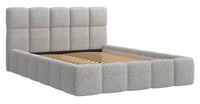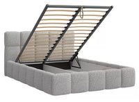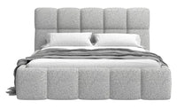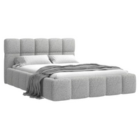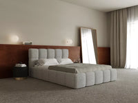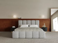 Miegamojo lova SOFTY, Puente 80 – elegantiška lova su apvalių kvadratų rašto galvūgaliu, talpia patalynės dėže ir patikimu metaliniu stelažu. Pilkas veliūras su hidrofobine, lengvai valoma technologija užtikrina ilgaamžiškumą ir komfortą.