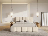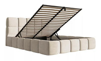Miegamojo lova SOFTY, Piano 02 – moderni lova su užapvalintų kvadratų rašto galvūgaliu, dujiniais pakėlėjais ir talpia dviejų kamerų patalynės dėže. Šviesiai bežinis, švelniai blizgus veliūras (hidrofobinis, lengvai valomas) suteikia jaukumo ir palengvina priežiūrą, o metalinis stelažas užtikrina stabilumą.