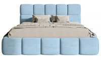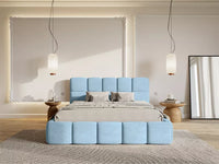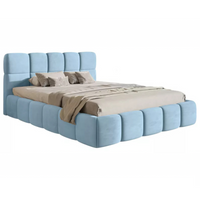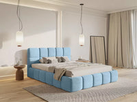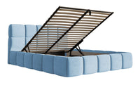 Miegamojo lova SOFTY, Piano 11 – moderni lova su žydru, švelniai blizgiu veliūru, dujiniais pakėlėjais ir didele dviejų kamerų patalynės dėže. Metalinis stelažas su tankiai išdėstytomis lamelėmis suteikia stabilumą ir komfortą.