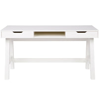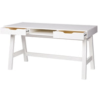 Rašomasis stalas NIKKI, balta – priklauso NIKKI miegamojo serijai; 2 praktiški stalčiai su metaliniais bėgeliais ir atvira niša viduryje; šiuolaikiškas, patvarus pasirinkimas mokslams ar darbui.