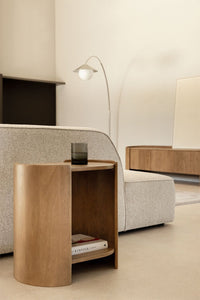 SVAMEA – ovalus pagalbinis staliukas su papildoma apatine lentyna; šiuolaikinės elegancijos ir mango medžio šilumos derinys.