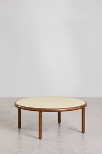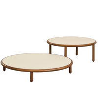 OKESUA rinkinys – du apvalūs akacijos medžio kavos staliukai su švariu dizainu, jaukiai atmosferai ir patogiam bendravimui.