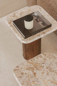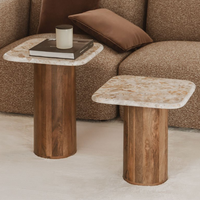 Rinkinys iš 2 kavos staliukų MRUERVAME – du kvadratiniai stalai su marmuro stalviršiais ir mango medžio cilindrinėmis bazėmis; statykite kartu ar atskirai.