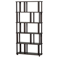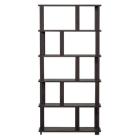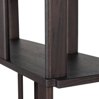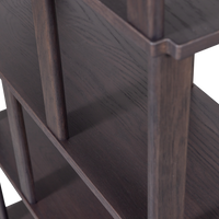 Knygų lentyna Riss, ąžuolas, ruda spalva. Moderni atvira lentyna su kūrybišku išdėstymu ir dideliais atvirais paviršiais.