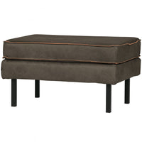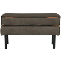 Not available for the UK. This article is not Fire Retardant. - Generous, comfortable footstool - Part of the well-known Rodeo series - Upholstered in leather look (70% leather / 30% polyester) - H 45 cm x W 84 cm x D 54 cm The Rodeo series by Dutch interior label BePureHome is modern, sturdy and contemporary. The Rodeo's are spacious and offer a wonderfully firm seating comfort. The high leg frame makes the furniture look slender and airy. Rodeo is known for its timeless combination of colours and materials, inspired by the 50's and given a modern twist. Dare to go Rodeo! Material The Rodeo stool is made of a combination of solid wood, chipboard, polyurethane foam with a density of 25 kg/m3 and a zigzag spring. The seat contains a polyurethane foam with a density of 30 kg/m3 (HR3532). This Rodeo is upholstered in a leather look. Our Copa leather look has a unique appearance and, thanks to the use of leather remnants, is a sustainable choice! The leather look consists of 70% beef leather fibres and 30% polyester and has a Martindale of 30,000. The material is made up of two parts: the bottom layer consists of recycled leather fibres, which gives it its natural look. The upper layer is a polyester cover layer that protects the leather and prevents unevenness. This makes it a sturdy combination fabric. The microfibre is knitted from very small synthetic fibres. This production technique ensures the sturdiness and a fine, soft feel. The fabric is very colourfast. During use, the appearance and structure of the fabric will show more of its natural characteristics, but this does not change the durability and quality. Dimensions The Rodeo stool has a total height of 45 cm, width of 84 cm and depth of 54 cm. The metal legs are 20 cm high. The footstool can carry 100 kg. Maintenance Clean this combination fabric weekly with a damp cloth. Stains? Use neutral soap to remove the stain and pat dry with a damp cloth, definitely do not rub. Rubbing leads to light stains in the fabric. Do not place the furniture in direct sunlight, this can cause light spots. Discoloured leatherlook will never regain its original colour. The Copa leather look does not need to be impregnated, treating it with leather grease is strongly discouraged. Delivery The Rodeo stool is delivered in one package. The legs are easy to attach using the supplied assembly instructions. To protect hard floors, place felt glides on the underside of the legs.