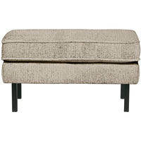 - Generous, comfortable hocker - Part of the famous Rodeo series - Upholstered in coarse velvet (100% polyester) - H 45 cm x W 84 cm x D 54 cm The Rodeo series by Dutch interior design label BePureHome is modern, tough and contemporary. The Rodeos are generous and offer wonderfully firm seating comfort. The high leg frame gives the furniture a slender and airy appearance. Rodeo is known for its timeless colour and material combination, inspired by the 1950s and given a contemporary twist. Dare to go Rodeo! Material The Rodeo hocker is constructed from a combination of solid wood, chipboard, polyurethane foam with a density of 25 kg/m3 and zigzag springs. The seat contains a 30 kg/m3 density polyurethane foam (HR3532). This Rodeo is upholstered in a chunky velvet. Our rich Ferra velvet has a distinctive texture, providing a luxurious look and special shine. The soft fabric is made of 100% polyester, which makes maintenance very easy. The Ferra textured velvet has a Martindale of 85,000, making it highly resistant to scratching, fading and pilling. Ferra is very soft to the touch because of its chenille yarns, the jacquard weaving technique creates a voluminous upholstery. Dimensions - Height: 45 cm - Width: 84 cm - Depth: 54 cm - Leg height: 20 cm - Leg thickness: 3x3 cm - Weight capacity: 100 - Weight: 17.5 kg Maintenance Small stains can be easily removed with a damp cloth, larger stains can be dabbed with a damp cloth and a neutral furniture shampoo. If the fabric can be detached from the furniture, it can be washed inside out at 30 degrees. To maintain the velvet shine, it is recommended to brush the furniture weekly with a special velvet brush. As a rule, we do not recommend impregnating our upholstered furniture. However, should you wish to do so, please test the impregnating agent on an invisible part of the fabric beforehand. Delivery The Rodeo footstool is delivered in one package. The legs are easy to attach using the supplied assembly instructions. To protect hard floors, place felt glides on the underside of the legs.