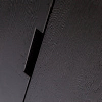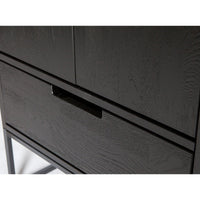 Aukšta spinta Silas, šukuotas uosis, juoda. Elegantiška siaura spinta su stalčiumi ir keturiomis lentynomis – modernus pasirinkimas interjerui.