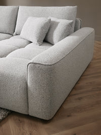 Sofa aptraukta pilku struktūriniu audiniu, kuris išsiskiria subtiliu melanžiniu efektu ir maloniu minkštumu. Audinys atsparus dėvėjimuisi, lengvai derinamas prie skirtingų spalvinių sprendimų ir suteikia baldui solidų, ilgaamžį charakterį.