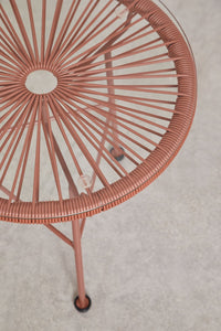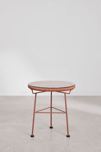 Šoninis staliukas ALISSA Ø45 cm pagamintas iš milteliniu būdu dažyto plieno, pintos sintetinės vytelės ir stiklo viršaus. Lengvas, bet tvirtas, puikiai tinka svetainei, prieškambariui ar poilsio zonai.
