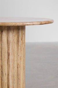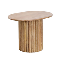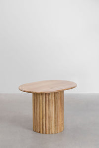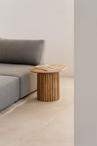 BVAMEA šoninis staliukas iš mango medžio – cilindrinė centrinė koja, vertikalios lentjuostės ir minimalistinė forma kuria natūralų jaukumą.