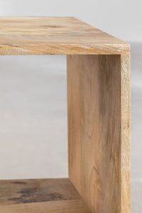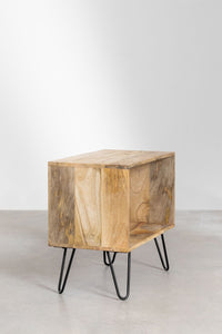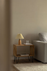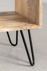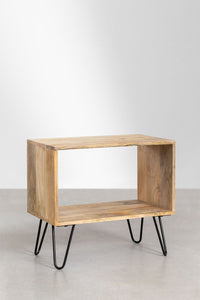 Šoninis staliukas DARDA 42x30 cm iš mango medienos su juodomis geležinėmis kojomis; papildoma niša knygoms ar aksesuarams, natūralus šiltas raštas.