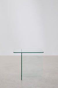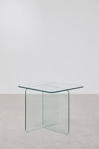 Šoninis staliukas ERIENA 50×50 – vientisas grūdintas stiklas, švelniai užapvalinti kampai ir skulptūriškos kojelės; vizualiai lengvas, bet itin tvirtas.
