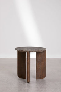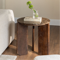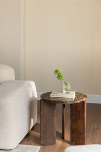Šoninis staliukas LLEANDI su natūralaus akmens viršumi ir mango medienos kojomis – subtilus derinys mažesnėms erdvėms.