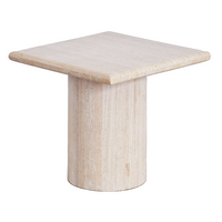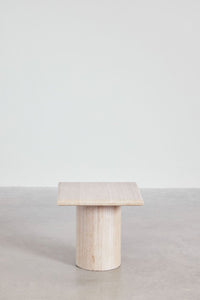 Šoninis staliukas LREILVI iš travertino – kvadratinis viršus, cilindrinė bazė, modernus akmens akcentas svetainėje ar miegamajame.