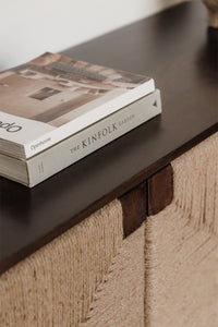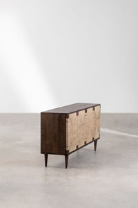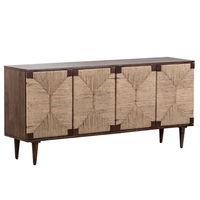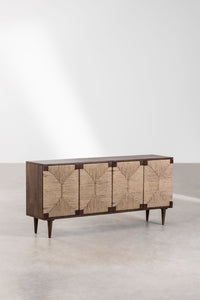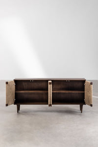 Kredensas EVUTI – mango medis ir jutės pynimo durys; 4 push-to-open durys, viduje 2 fiksuotos lentynos, minkšti padukai grindų apsaugai.