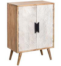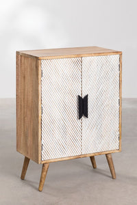 SALSE – kompaktiškas mango medžio kredensas su raižytais fasadais, metalinėmis rankenėlėmis ir MDF nugarėle; talpus ir charakteringas.