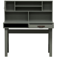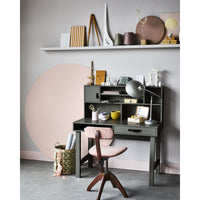 Rašomasis stalas STAGE, žalios muilo spalvos – žaismingas, praktiškas stalas su aukšta galine sienele ir daugybe atvirų skyrių bei stalčiumi tvarkingam darbastaliui.