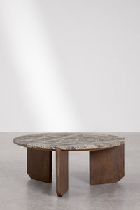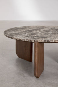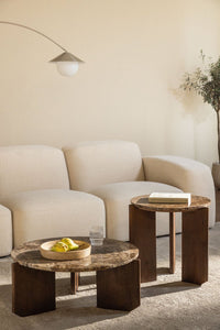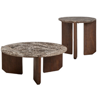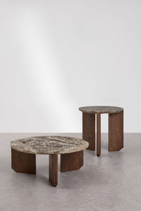 Komplektas LLEANDI – du apvalūs staliukai su natūralaus akmens viršumi ir mango medienos kojomis, kuriuos galima naudoti kartu ar atskirai.