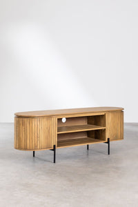 TV spintelė ADUMIA iš mango medžio su lentynomis ir galine kabelių anga – tvarkingai paslepia įrangą ir laidus, išlaikydama elegantišką vaizdą.