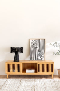 TV spintelė AONKI iš bambuko – natūralus ir praktiškas baldas su trimis erdvėmis ir slankiojančiomis durelėmis.