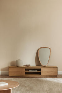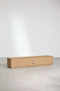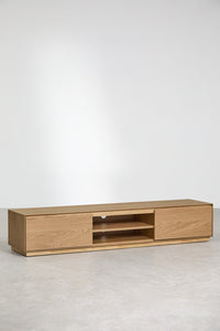 TV spintelė BONKISA – MDF su natūralia ąžuolo faneruote; atvira centrinė niša su lentynomis ir dvi uždaros sekcijos, klasikinis natūralus tonas.