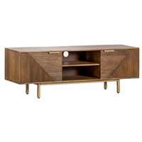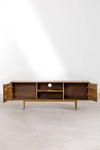 TV spintelė BORKU iš mango medžio su žalvario atspalvio kojomis ir rankena – 2 stalčiai, apatinė lentyna ir galinė kabelių anga tvarkingai multimedijai.