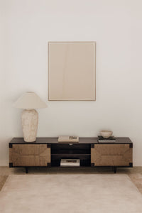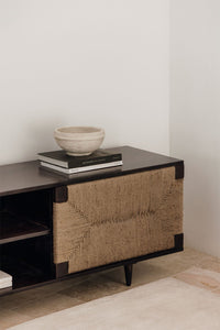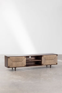 TV spintelė EVUTI 200×40 – 100% mango medis ir jutės pynimo durys; kelios nišos laikymui, push-to-open mechanizmai, minkšti padukai.