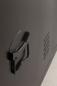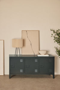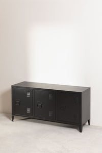 PMELUA plieninė TV spintelė – 3 durys su vidine lentyna ir tvarkingu kabelių valdymu; laikui nepavaldus, modernus industrinis charakteris.