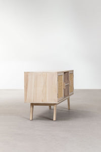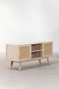 TV spintelė RELDU DANDIA iš paulovnijos su dviem rataninėmis durimis ir centrine niša, gale – angos kabeliams; natūrali matinė apdaila, lengvas ir stabilus korpusas.