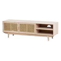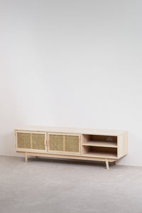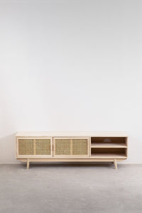 RELDU TV spintelė ant kojų – paulovnijos medis ir rataniniai akcentai, gausi vieta įrangai, tvarkingas kabelių išvedimas.