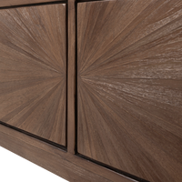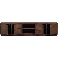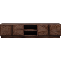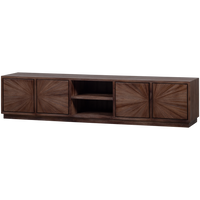 Prabangi ir moderni TV spintelė. Pagaminta iš perdirbtos tikmedžio medienos. Papildomas grožis: rafinuotos detalės ant durų. Medžiaga: Tikmedis yra tropinė kietmedžio rūšis ir labai patvari mediena. Tikmedis pasižymi tamsiai ruda/raudona spalva, o tai suteikia jai labai prabangų vaizdą. Matmenys: Aukštis: 45 cm. Plotis: 200 cm. Gylis: 44 cm. Durų storis: 2 cm. Svoris: Nenurodytas. Priežiūra: Tikmedžio baldus valykite švaria, sausa šluoste. Nevalykite tikmedžio su pernelyg dideliu vandens kiekiu, nes tai gali šiurkštinti medienos pluoštą. Pristatymas: Sun TV spintelė pristatoma pakuotėje, reikalingas savitvirtinimas.