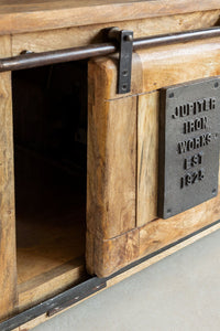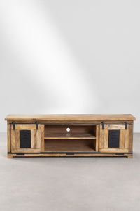 TV spintelė UDUMI 160×40 – pagaminta iš mango medienos su metalo detalėmis. Trys skyreliai su stumdomomis durimis leidžia paslėpti nereikalingus daiktus ir palaikyti tvarką.