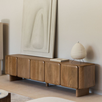 TV spintelė ZENEERO 215 cm – išskirtinė mango medienos TV zona su apvalintomis briaunomis ir tvarkingu, šiuolaikišku siluetu. Dvi laidų angos leidžia paslėpti kabelius ir išlaikyti švarią estetiką. Durelės su magnetais ir švelnaus užsidarymo vyriais užtikrina patogų, saugų naudojimą. Pusiau blizgi akrilinė lako apdaila padeda apsaugoti paviršių, o guminės kojelių apsaugos saugo grindis.