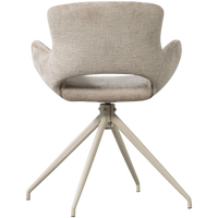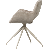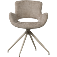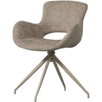 Prabangi pasukama valgomojo kėdė. Velveto apmušalas (100% poliesteris) su metaliniu pagrindu. Tvirtas, patogus sėdynė. Eliva yra apmušta Sissy velvetu. Šis grubus velvetas turi ryškią tekstūrą ir Martindale įvertinimą 40 000. Medžiaga: Pagrindas pagamintas iš metalo. Matmenys: Aukštis: 58 cm. Plotis: 58 cm. Gylis: 82 cm. Sėdynės aukštis: 49 cm. Svoris: Nenurodytas. Priežiūra: Mažos dėmės lengvai pašalinamos drėgna šluoste. Įsisenėjusioms dėmėms rekomenduojama nusausinti drėgna šluoste ir neutraliu apmušalų šampūnu. Bėgant laikui dažnai naudojamose vietose gali atsirasti blizgus sėdynės paviršius. Pristatymas: Valgomojo kėdė pristatoma po vieną vienetą ir yra lengvai surenkama.