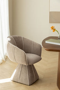 Valgomojo kėdė TALLIN, aptraukta švelniu rudos spalvos šeniliniu audiniu, sujungia modernų dizainą ir klasikinį komfortą. Šios kėdės minimalistinės linijos ir 360° pasukama bazė suteikia elegancijos bei praktiškumo kiekvienai erdvei. Tvirta metalo ir medžio konstrukcija užtikrina ilgaamžiškumą, o putų užpildas – 28 kg/m³ sėdimoje dalyje ir 22 kg/m³ atloše bei porankiuose – garantuoja patogumą ilgiems vakarams prie stalo. Stabili bazė su apsauginiais antgaliais saugo grindis nuo įbrėžimų ir suteikia tvirtumo.