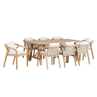 Valgomojo komplektas DUBAI su 8 kėdėmis – tai išskirtinė kombinacija stiliaus, tvirtumo ir funkcionalumo. Komplekto sudėtyje yra didelis stalas iš akacijos medienos (200x100 cm) ir 8 kėdės su ergonomiškais porankiais ir minkštomis pagalvėlėmis. Tiek stalas, tiek kėdės pasižymi tvirta konstrukcija, atsparia oro sąlygoms ir suteikia natūralaus medžio žavesį. Kėdžių atlošai ir sėdimosios dalys papildytos nuimamomis poliesterio pagalvėlėmis, kurios užtikrina komfortą. Stalas turi X formos kojas ir išraiškingą medinį stalviršį, kuris puikiai dera su natūraliu aplinkos dizainu.