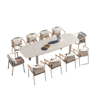 Stilingas ir modernus lauko valgomojo komplektas ZINTI – YERVIN su išskleidžiamu stalu (220–280x100 cm) iš keramikos ir 10 patogių kėdžių iš aliuminio su boucle audiniu. Puikus pasirinkimas lauko terasai ar sodui – funkcionalus, patvarus ir išskirtinio dizaino.