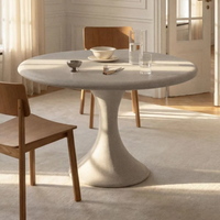 Apvalus valgomojo stalas ARVUERO Ø120 cm iš cemento – tvirtas, ilgaamžis ir labai jaukus pasirinkimas, kai norisi apvalaus stalo šeimos susibūrimams. Subtilios, suapvalintos linijos ir „mid-century“ nuotaika suteikia šilumos, o bazės forma primena stilizuotus medžio kamienus – tai kuria natūralų, ramesnį interjero jausmą. Apvali stalviršio forma praktiška: lengviau bendrauti su visais prie stalo, o namuose su vaikais saugiau, nes nėra aštrių kampų. Cemento konstrukcija padengta apsauginiu poliuretano sluoksniu, todėl stalas atsparesnis kasdieniam naudojimui, o apačioje esančios guminės pagalvėlės saugo grindis ir leidžia stalą patogiau pastumti. Kadangi cementas yra porėta, natūrali medžiaga, kiekvienas stalas gali turėti unikalių paviršiaus ir tono niuansų – tai natūrali savybė, kuri kiekvieną gaminį daro išskirtinį.
