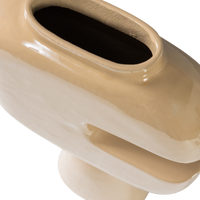 Pagaminta iš aliuminio. Stilinga, abstraktaus dizaino vaza. Neįprasta atvira forma daro šį kūrinį tikru dėmesio centru. Švelnus smėlio atspalvis sukuria šiltą ir modernų vaizdą. Medžiaga: Aliuminis yra labai tinkamas metalas dėl savo lengvo svorio, tvirtos sudėties ir lankstumo. Aliuminis yra atsparus korozijai, todėl tinka naudojimui lauke. Matmenys: Aukštis: 31 cm. Plotis: 21 cm. Gylis: 7 cm. Angos matmenys: 8 cm x 4 cm. Svoris: 1.3 kg. Priežiūra: Apdorotą aliuminį lengva valyti šiek tiek drėgna šluoste ir švelniu valikliu; nusausinimas užtikrina be dryžių rezultatą. Pristatymas: Vaza pristatoma individualiai.