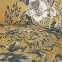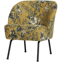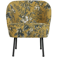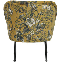 VOGUE fotelis (veliūras, garstyčių geltona, gėlių raštas) – išraiškingas akcentas ir patogi sėdėsena.